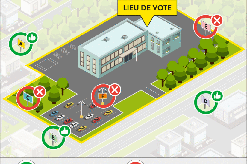 Une pancarte électorale ne doit compromettre la sécurité routière et piétonnière. Ainsi, elle ne peut nuire à leur circulation, ni à leur visibilité (incluant la signalisation).