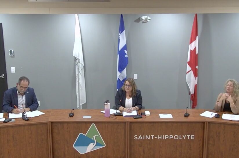 @BV : À la table du conseil, Yves Dagenais, Isabelle Poulin et Sonia Tremblay ont participé au 1er débat de l’histoire à la mairie de Saint-Hippolyte. Photo capture d’écran