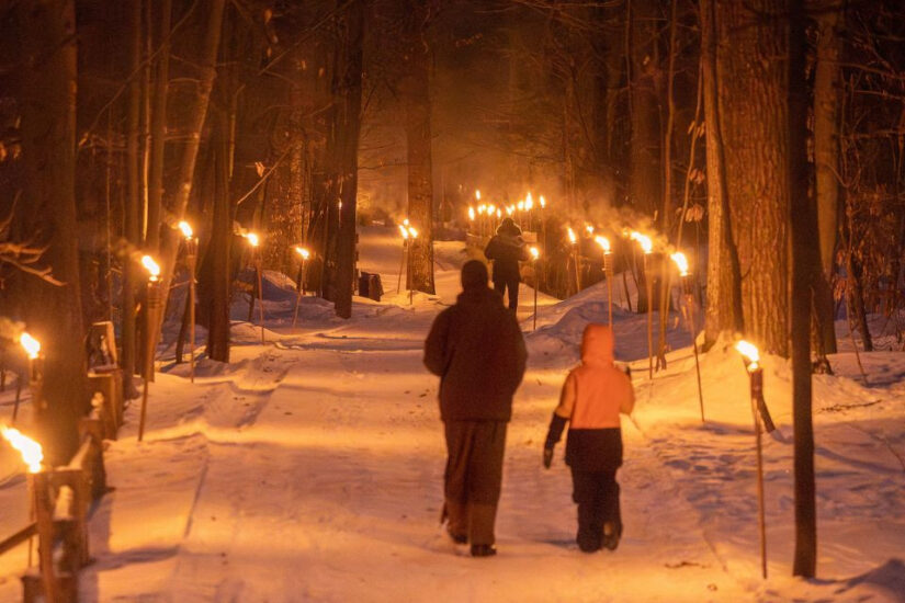À faire à pied ou en raquette, cette randonnée permet de profiter des joies de l’hiver en parcourant un sentier damé éclairé et ponctué de surprises. Le dernier départ dans le sentier est à 20 h 15. Les flambeaux seront éteints à 21 h.