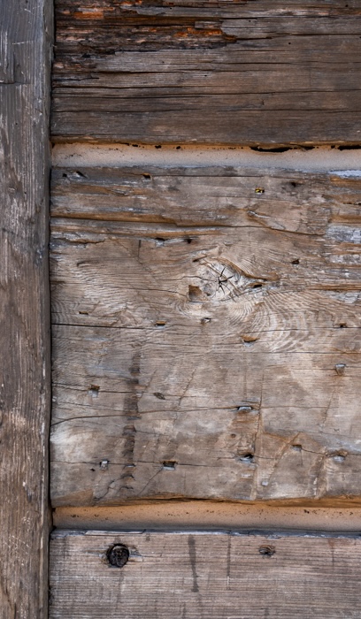 Le revêtement de la maison est fait de vieilles poutres de bois équarries à la hache. Celles-ci ont été fendues en trois. Les côtés rough et travaillés habillent l’extérieur, et les morceaux lisses du centre recouvrent les murs intérieurs. Cela donne l’impression d’une maison pièce sur pièce, mais en fait, elle est isolée au milieu, comme une maison moderne.