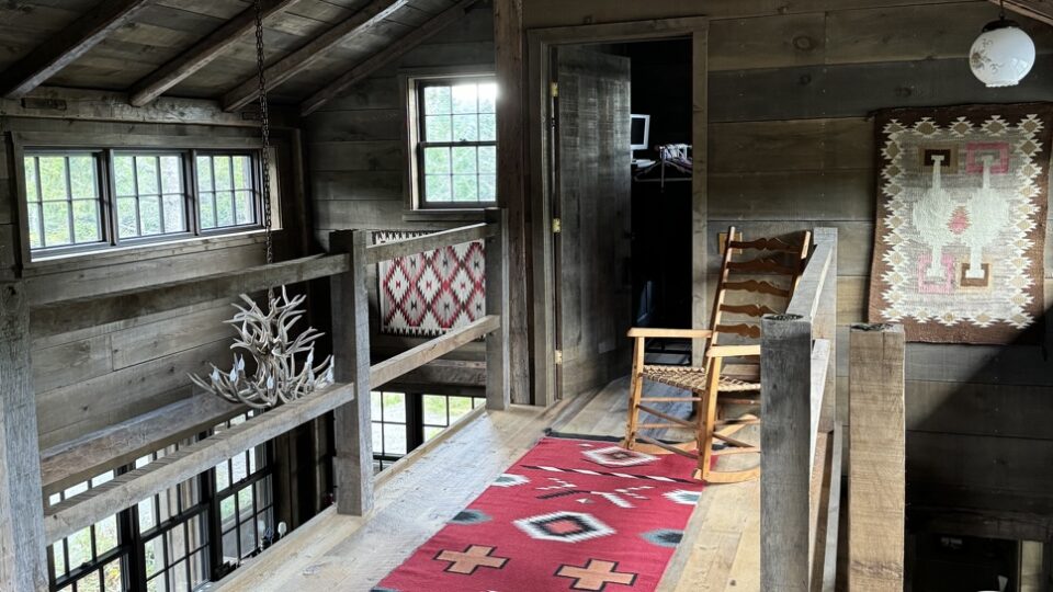 À l’intérieur, on retrouve des tapis navajos originaux qui viennent du Mexique, un chandelier suspendu fait de bois de chevreuils, une peau de vache, et bien d’autres trésors. Une carabine, accrochée au mur, complète la décoration.