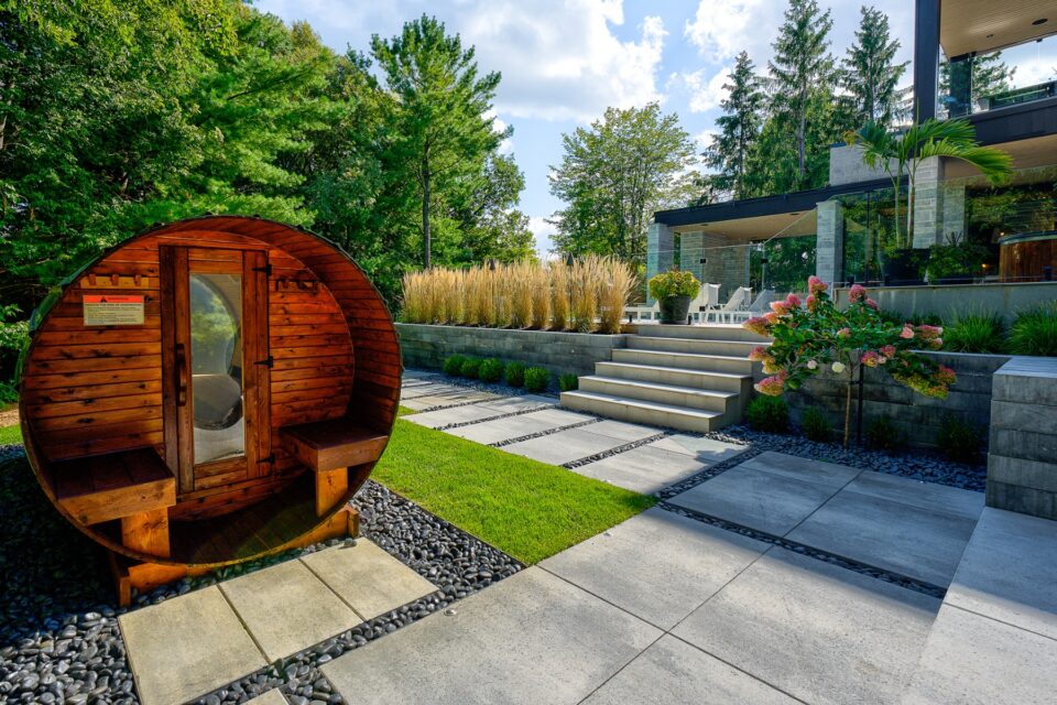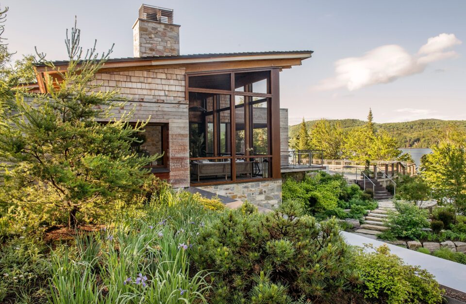 Pour cette propriété située en bordure de lac, la firme d’architecture du paysage Stuart Webster Design a capitalisé sur le potentiel de vues panoramiques, sur la création d’espaces ouverts ou nichés ainsi que sur le développement d’un sentier en forêt. Elle a proposé entre autres, la plantation de nombreux arbres indigènes de grande taille. Les matériaux naturels comme la pierre, le bois et les galets ont été privilégiés.