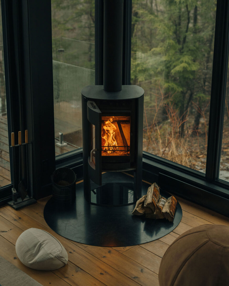 Chaque élément des refuges reflète cette philosophie, que ce soit par les livres et les magazines choisis avec soin sur la table à café, la table tournante pour y faire jouer des vinyles, les meubles japonais des années 70… « C’est très important pour nous que l’espace soit chaleureux, qu’il ait une âme, et qu’il ne soit jamais froid, souligne Emily. Vert olive, terracotta, Burgundy : ces couleurs qu’on retrouve dans les refuges nous font sentir plus connectés à la Terre et à la nature. »