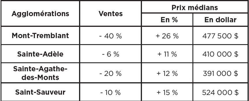 « Les ventes résidentielles ont évolué de manière très différente selon les agglomérations », est-il mentionné dans le rapport. Par exemple, du côté de Mont-Tremblant, les ventes résidentielles ont chuté de 40 %, alors que le prix médian des unifamiliales a grimpé de 26 % pour une valeur de 477 500 $. Pour l’agglomération de Sainte- Agathe-des-Monts, on note une baisse de 20 % des ventes et une augmentation du prix médian de 12 %. Ce dernier atteint ainsi une valeur de 319 000 $.