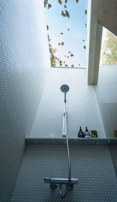 Ce bandeau de fenêtre aurait même pu être plus bas. Mais alors, tout le corps aurait été exposé à l’extérieur. Comme la fenêtre commence aux épaules, le regard est porté vers l’extérieur, et la vue est sans entrave, mais l’intimité est tout de même préservée.