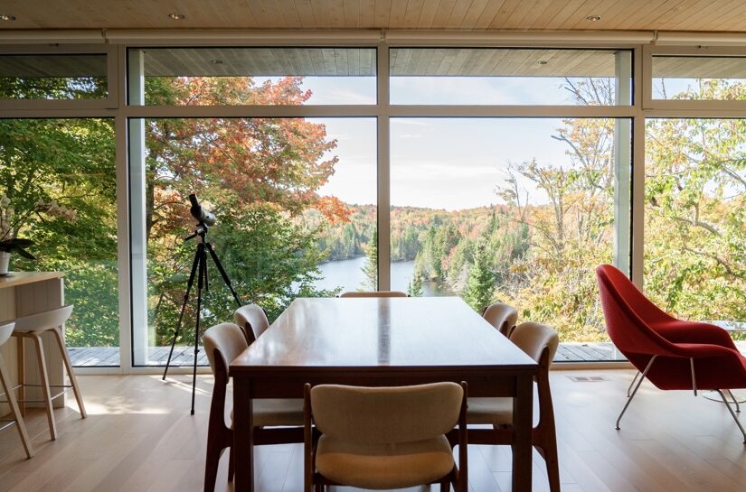 Comme les murs ne sont pas porteurs (la maison est supportée par de minces pilotis), un bandeau de fenêtre fait le tour de la maison, à la hauteur des épaules. Ainsi dans la chambre principale, le regard traverse les fenêtres, passant de l’intérieur (la chambre) à l’extérieur (la pièce sans mur) à l’intérieur (le salon) à l’extérieur (la vue sur le lac). « Au bout du compte, dehors et dedans, c’est pareil. C’est ça, l’idée. »