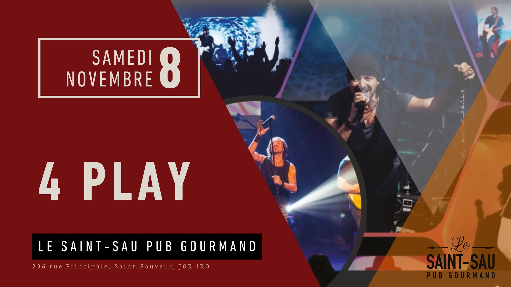 « Prépare-toi pour une soirée pleine d’énergie avec 4PLAY, un groupe québécois qui revisite les plus grands hits rock, pop et dance des dernières décennies. »