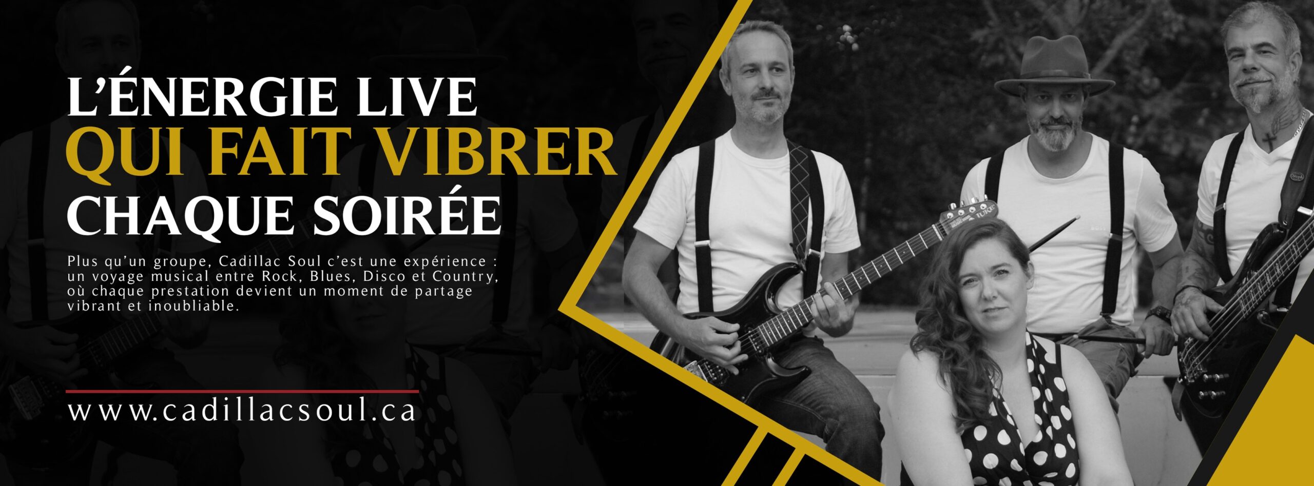 « Préparez-vous pour une soirée de pur plaisir musical avec Cadillac Soul au Bistro Bar du parcPlongez dans une ambiance survoltée où le rock, le blues, le disco et le country se rencontrent pour créer un moment inoubliable. »