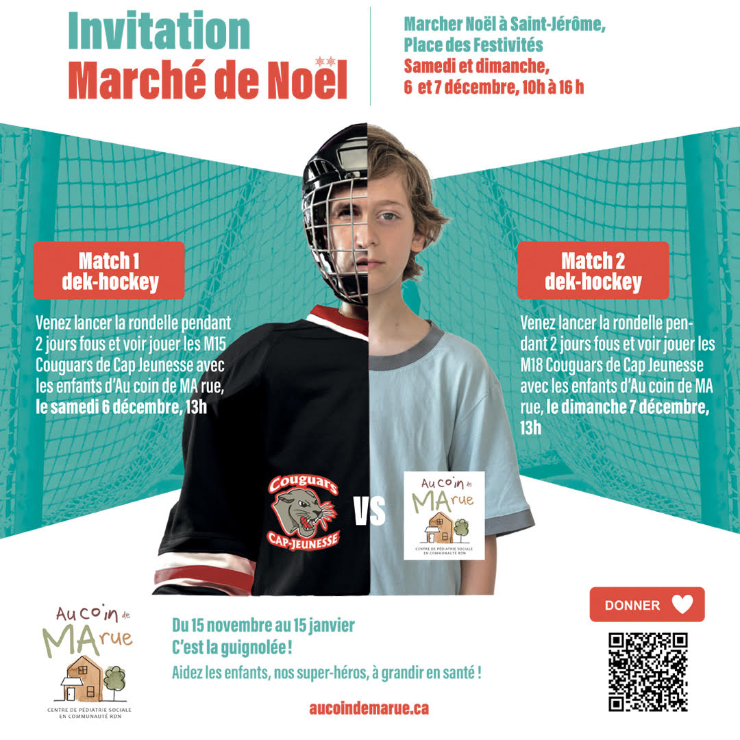 L’équipe d’Au coin de MA rue, Centre de pédiatrie sociale, invite les familles au Marché de Noël de Saint-Jérôme les 6 et 7 décembre pour son activité annuelle de dek-hockey, organisée dans le cadre de sa Guignolée.