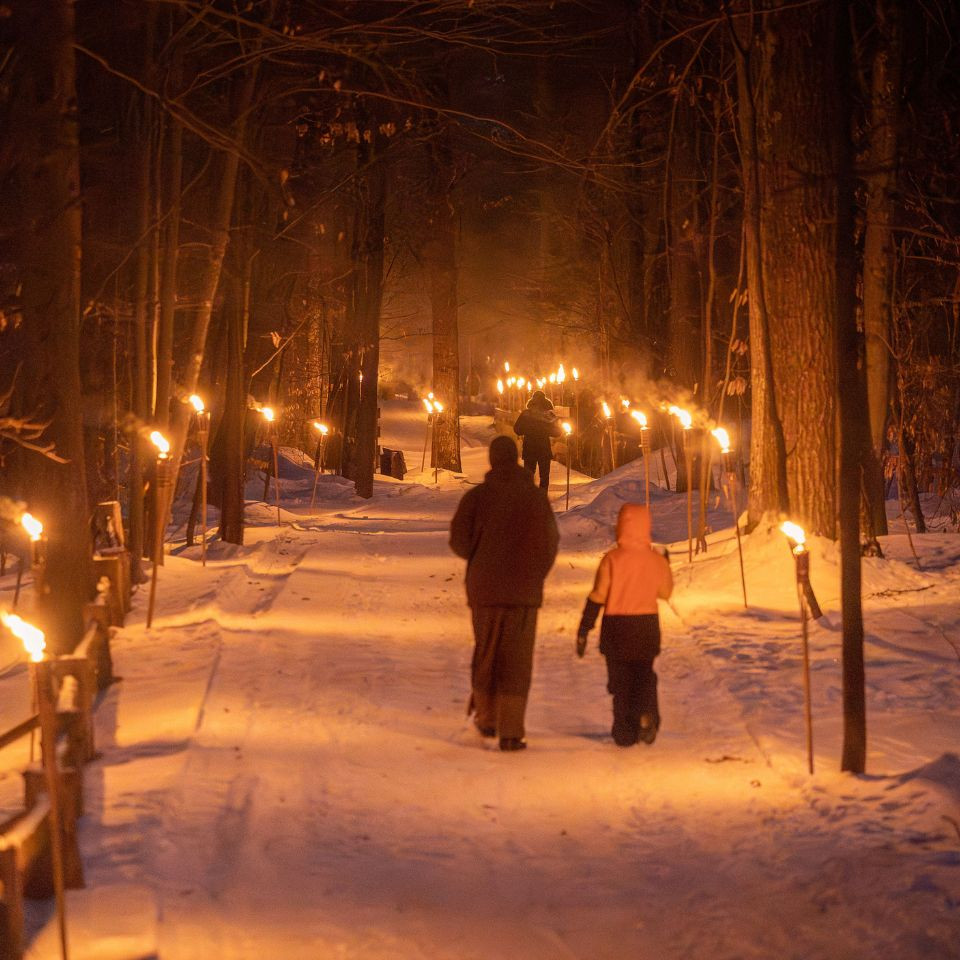 « Le vendredi 13 février de 18 h à 21 h, petits et grands sont conviés à une balade aux flambeaux sur la phase 2 de la piste cyclable. Un nouveau parcours vous attends cette année ! À faire à pied ou en raquettes, cette randonnée toute spéciale permet de profiter des joies de l’hiver en parcourant un sentier éclairé ponctué de surprises gourmandes. »