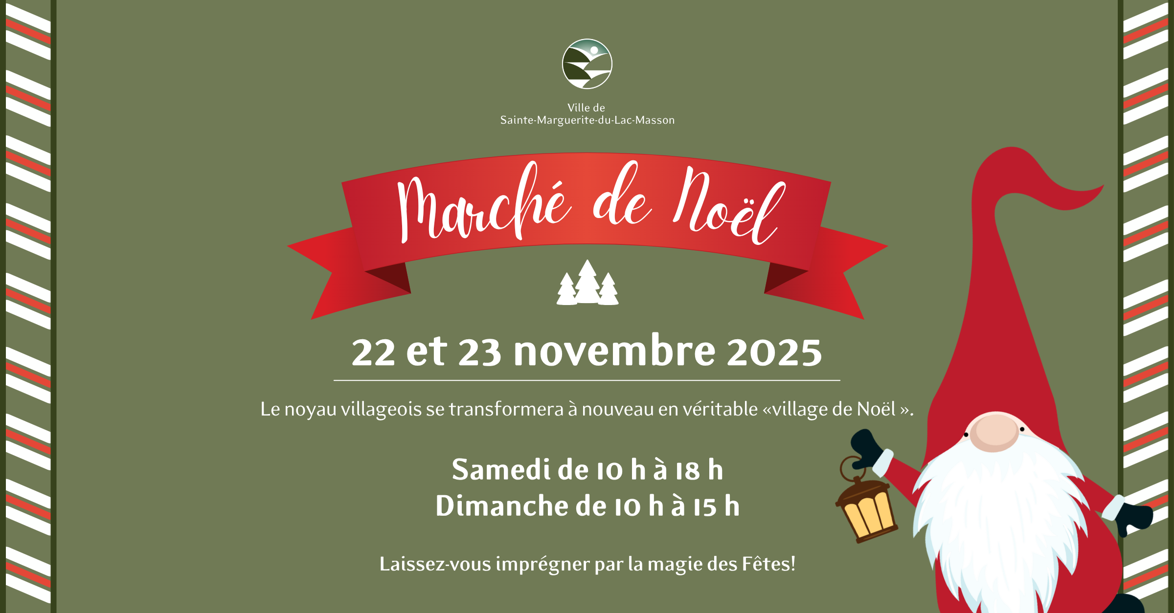 « L’espace d’une fin de semaine, l’hôtel de ville, le local du Club de l’Âge d’Or du Lac Masson, la bibliothèque ainsi que le parc Édouard-Masson se transformeront à nouveau en « village de Noël » avec plusieurs activités ainsi qu’une trentaine d’artisans qui vous feront découvrir leurs créations. »