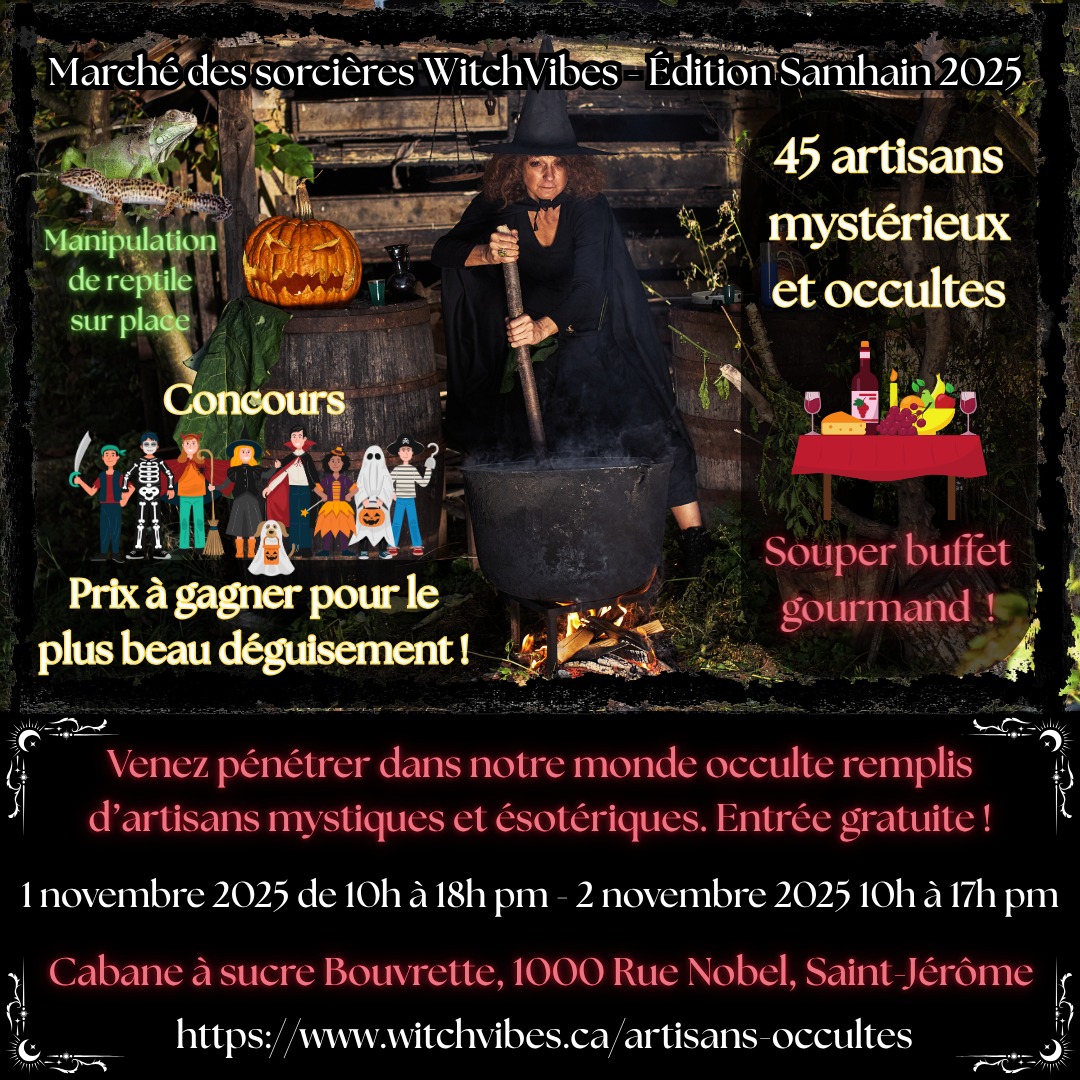 « Venez pénétrer dans notre monde occulte remplis d’artisans mystiques et ésotériques ! Le marché des artisans est pour tous les âges. À quoi vous attendre ? Un marché avec 45 artisans incroyables et mystérieux ! »