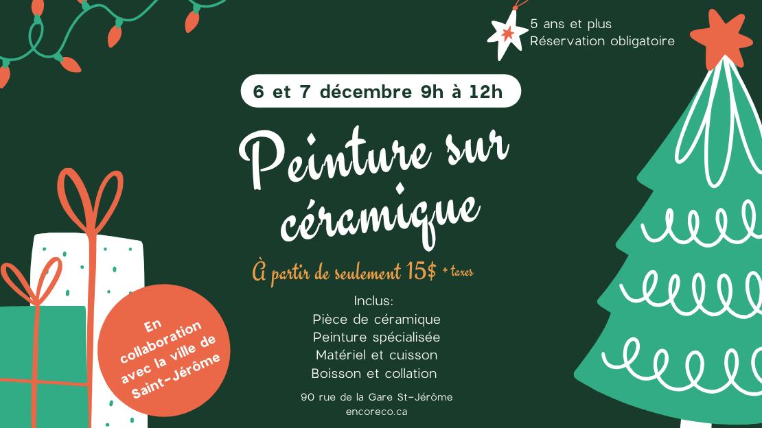 « Plongez dans l’esprit féerique des fêtes avec notre atelier Peinture sur Céramique, en collaboration spéciale avec la Ville de Saint-Jérôme, les 6 et 7 décembre de 9 h à 12 h.Venez partager un moment créatif et festif, où petits et grands pourront laisser libre cours à leur imagination. »
