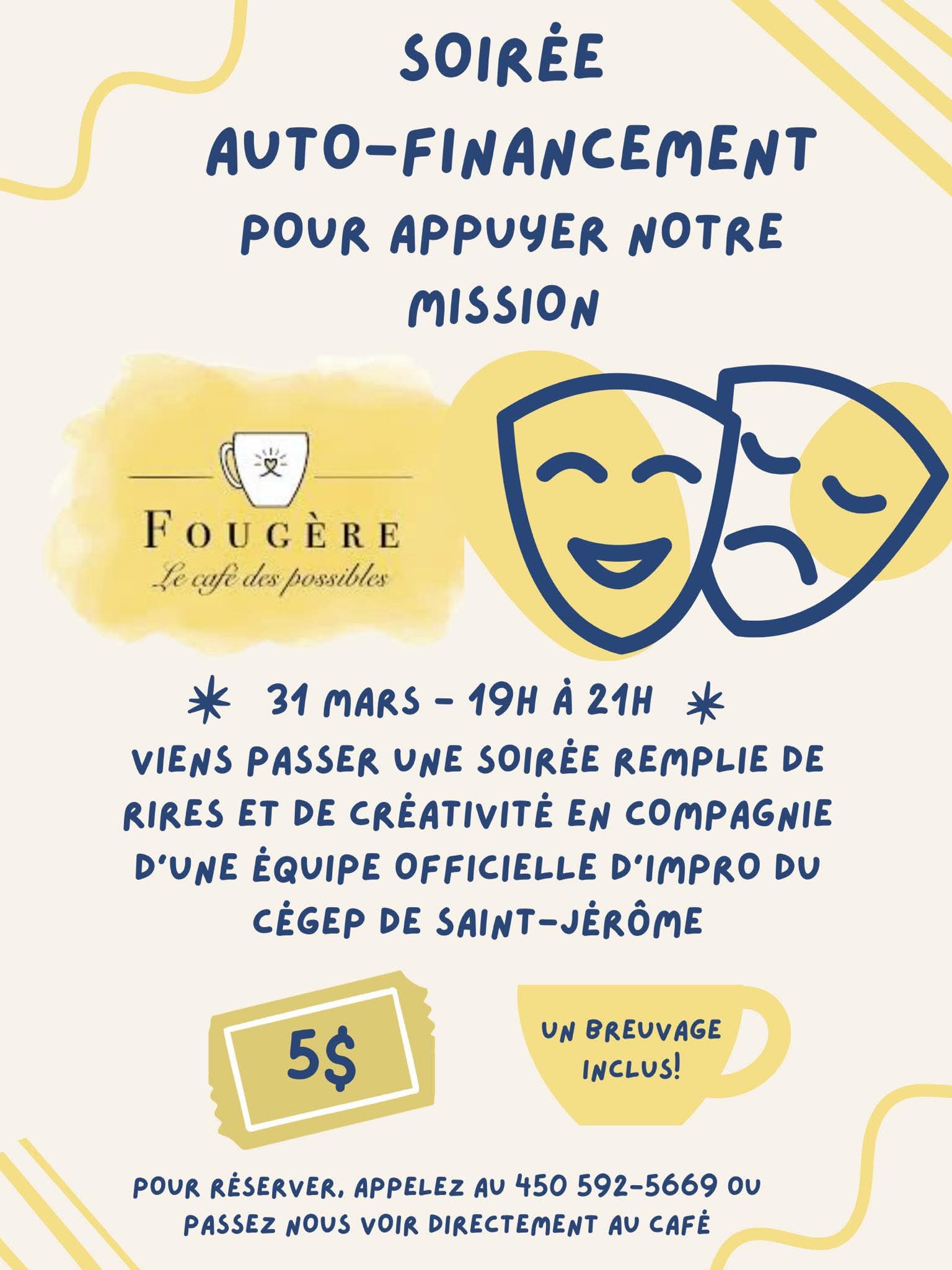 Le 31 mars de 19h à 21h, le Café Fougère accueille une soirée d’improvisation bénéfice avec le Cégep de Saint-Jérôme. Pour seulement 5 $ (incluant un breuvage), vivez un spectacle dynamique et imprévisible. Rires et créativité garantis pour soutenir une excellente cause locale !
