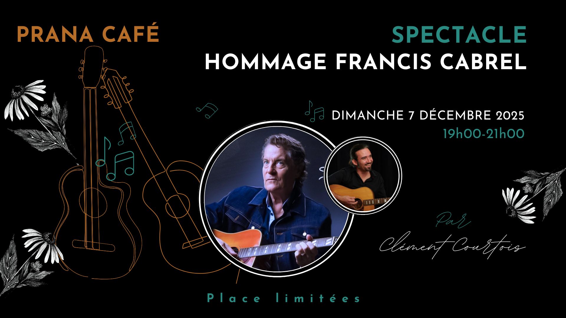 « Hommage à Francis Cabrel par Clément Courtois. Le spectacle débute à 19 , et l’ouverture des portes est à 17 h. Merci de contribuer au succès de nos événements ! »