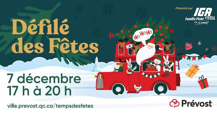 Défilé des Fêtes présenté par le IGA Extra Marché Piché 7 décembre de 17 h à 20 h Dans les rues de Prévost « Le 7 décembre dès 17 h, venez admirer le défilé dans votre quartier. Suivez-nous sur nos réseaux sociaux pour connaître le trajet et les points de rassemblement. N’oubliez pas vos tuques de Noël! »