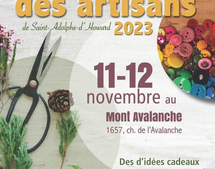 Le Salon des artisans est de retour pour une 12e année à Saint-Adolphe-d’Howard. Ça se passe les 11 et 12 novembre au Mont Avalanche, de 10h à 16h. « C’est le moment de venir faire vos emplettes pour le temps des fêtes! Le Salon des artisans, c’est des exposants, des produits du terroir, des idées cadeaux et beaucoup plus! » Pour plus d’informations, rendez-vous sur le site web de la Ville de Saint-Adolphe-d’Howard.