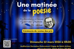 Envie de divertissement ? Planifiez votre prochaine sortie dans les Laurentides grâce aux recommandations du Journal ! Pour le calendrier complet des événements, rendez-vous sur notre site web. Ciné Optimiste Où : Salle Lionel-Renaud, Sainte-Sophie Quand : 20 mars à 18 h 30 « Projection d’un film et/ou de courts métrages. Restaurant sur place. Les enfants de 6 ans et moins doivent obligatoirement être accompagnés d’un adulte. » Olivier Martineau Où : Théâtre Gilles-Vigneault, Saint-Jérôme Quand : 20 mars…
