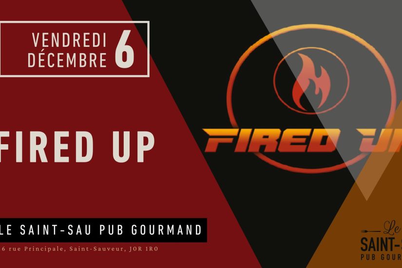 Le groupe Fired Up 6 décembre prochain à 21 h Saint-Sau Pub Gourmand, Saint-Sauveur « Fired Up est le nouveau groupe pop-rock tendance de Montréal, mettant en avant l’incroyable voix de Bernice Frans. Ils interpréteront un mélange de vos chansons rock classiques préférées ainsi que des morceaux pop-rock entraînants sur lesquels vous pouvez chanter et danser. »