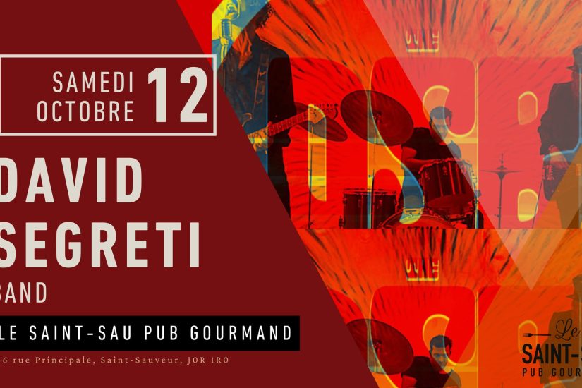 Le David Segreti Band est de passage au Saint-Sau Pub Gourmand le 12 octobre dès 21 h. « Laissez-vous charmer par ses mélodies envoûtantes et passez un moment convivial entre amis autour d’un bon plat et d’une bonne bière ! » Pour plus d’informations, consultez la page Facebook du Saint-Sau Pub Gourmand.
