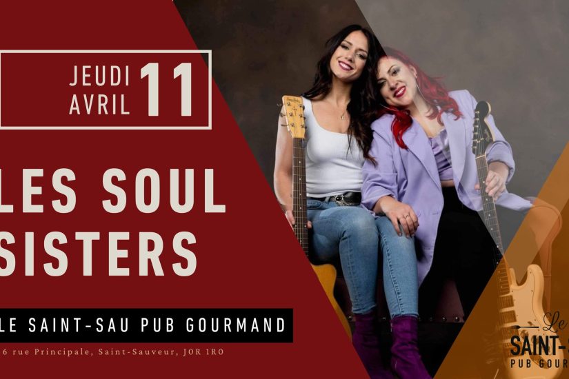 Les Soul Sisters vont être au Saint-Sau Pub Gourmand le 11 avril prochain à 19h30. « Préparez-vous à une soirée inoubliable et musicale avec Les Soul Sisters ! Venez vibrer et faire la fête avec nous ! » Pour tous les détails, consultez la page Facebook du Saint-Sau Pub Gourmand.
