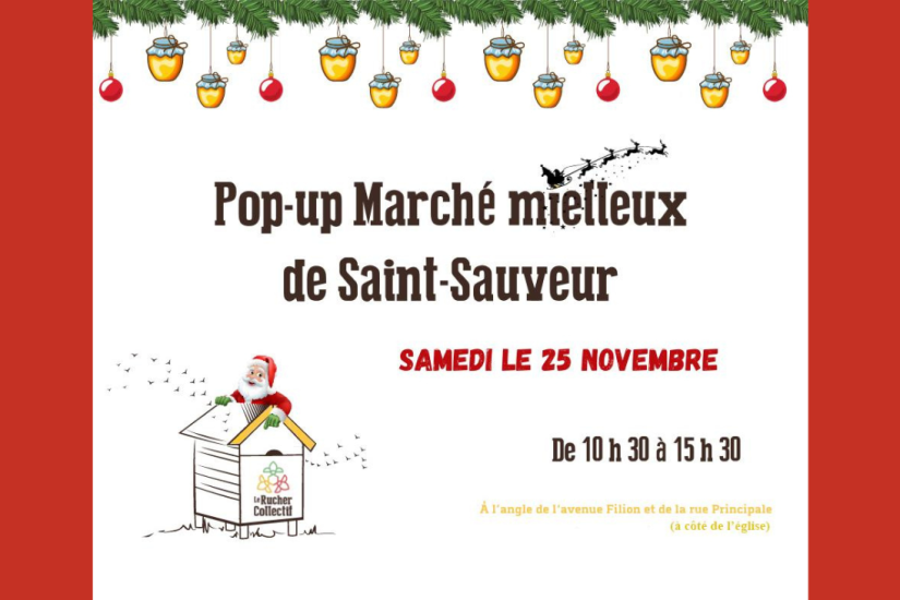 Le 25 novembre, de 10h30 à 15h30, le Rucher Collectif invite les citoyens de Saint-Sauveur à son Pop-up Marché mielleux, où les pots de miel de la cuvée 2023 seront mis en vente. Ça se passe à l’angle des rues Filion et Principale. Pour plus d’information, rendez-vous sur le site web de la Ville de Saint-Sauveur.