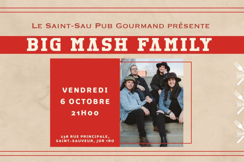 The Big Mash Family sera en spectacle le 6 octobre au Saint-Sau Pub Gourmand. « Êtes-vous prêts à danser? The Big Mash Family vous a concocté tout un spectacle! Allant du rock, au pop, au blues, au folk, le quatuor s’est follement amusé à trouver les meilleurs et improbables mash-up de chansons ! C’est un rendez-vous à ne pas manquer ! » Pour plus d’informations, rendez-vous sur la page Facebook du restaurant.