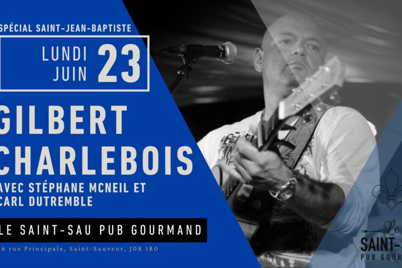 Où : Saint-Sau Pub Gourmand, Saint-Sauveur Quand : 23 juin à 21 h « Viens célébrer la Saint-Jean-Baptiste avec nous ! Pour l’occasion, Gilbert Charlebois, Stéphane Mcneil et Carl Dutremble se joindront à nous.Ils feront de votre soirée une expérience mémorable ! »