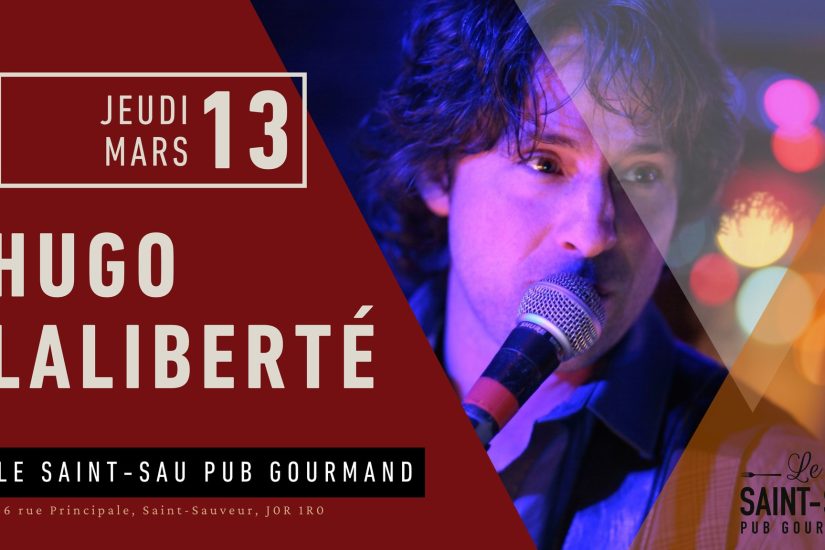 Où : Saint-Sau Pub Gourmand, Saint-Sauveur Quand : 13 mars à 19 h 30 « Hugo Laliberté sera au Saint-Sau Pub Gourmand, ce jeudi 13 mars dès 19h30 ! Réservez vos places dès maintenant, c’est un week-end à ne pas manquer ! »