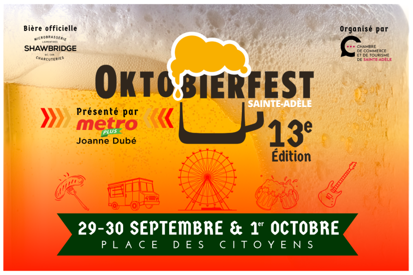 Du 29 septembre au 1er octobre, c’est le 13e édition de l’Oktobierfest à Sainte-Adèle. « Unique en son genre, l’Oktobierfest de Sainte-Adèle rassemble des microbrasseurs des quatre coins du Québec. C’est également un rendez-vous à ne pas manquer pour les restaurateurs et Food truck de la région des Pays-d’en-Haut. Un long week-end haut en couleur où tous se rassemblent sur le site de la Place des citoyens de Sainte-Adèle pour profiter de l’animation, de spectacles musicaux…