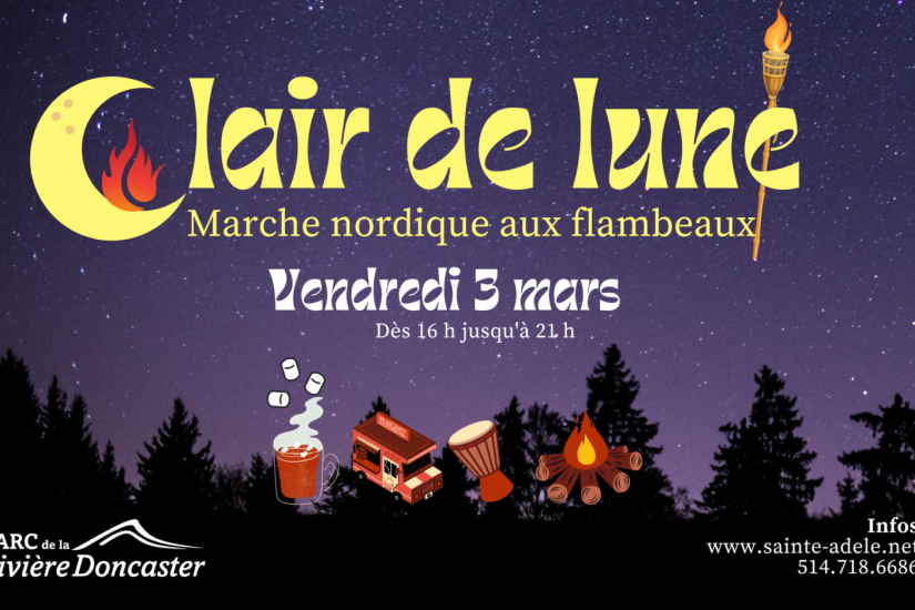 Voilà une autre façon de passer du temps dehors ! Sainte-Adèle propose une grande marche nordique aux flambeaux le 3 mars prochain. Profitez d’un accès au parc de la Rivière Doncaster pour aller prendre l’air à la tombée du jour. Cet événement pour toute la famille vous permettra de sillonner le parc librement entre 16 h et 21 h. D’ailleurs, des camions de cuisine de rue, un feu de camp, du chocolat chaud, du Caribou et…