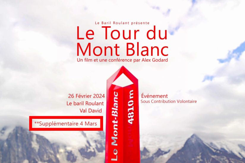 Le 26 février au Baril Roulant de Val-David, le film Le Tour du Mont Blanc sera présenté, suivi d’une conférence avec le cinéaste, Alex Godard. Pour tous les détails, consultez la page Facebook de l’événement.